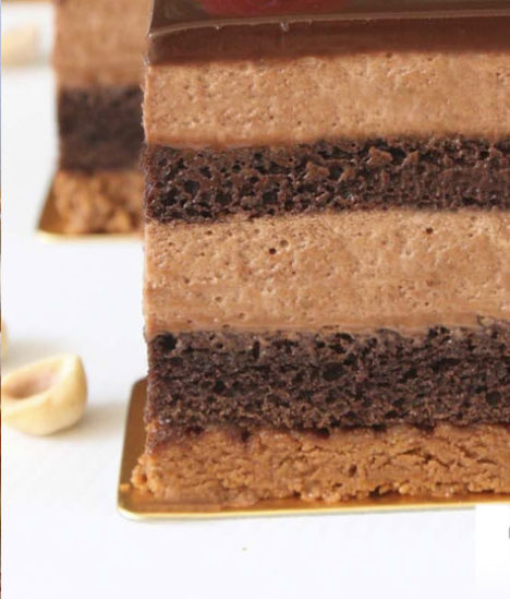 Στρώματα σκούρης έξτρα και ανοιχτόχρωμης έξτρα πάστας φουντουκιού (40%) εναλλάξ. Μπορείτε να δημιουργήσετε το δικό σας «δίχρωμο» κέρασμα.